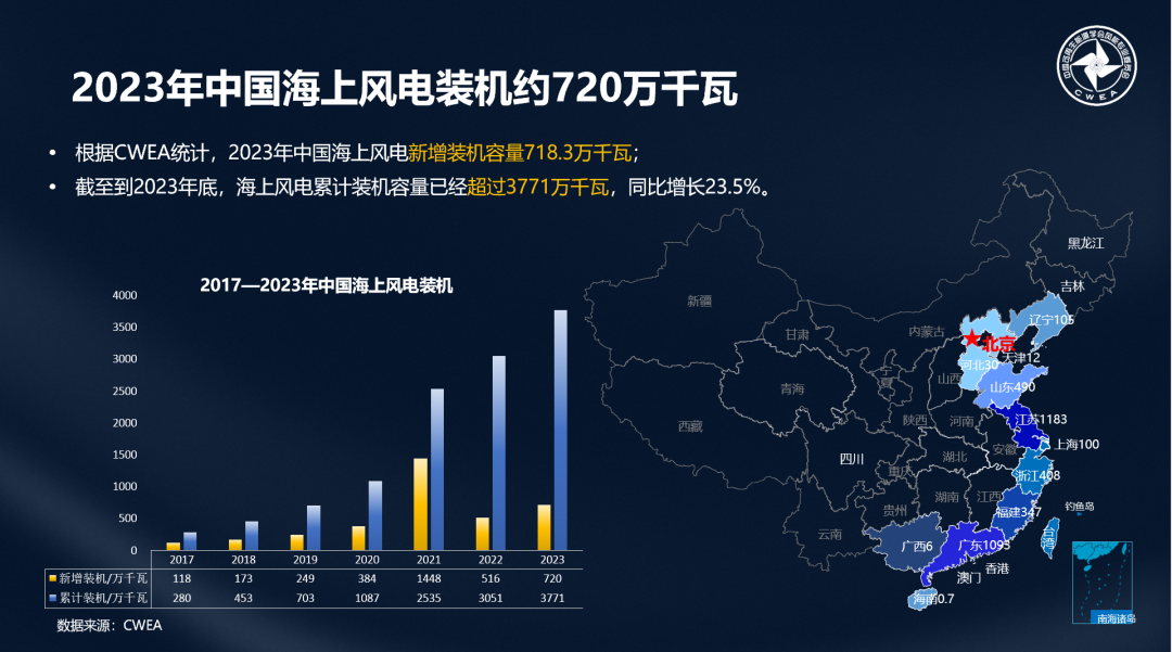 “十四五”前期,我國實現(xiàn)了海上風(fēng)電穩(wěn)步發(fā)展,CWEA數(shù)據(jù)顯示,2023年度海上風(fēng)電新增裝機(jī)容量718.3萬千瓦,累計裝機(jī)容量已經(jīng)超過3771萬千瓦,同比增長23.5%。