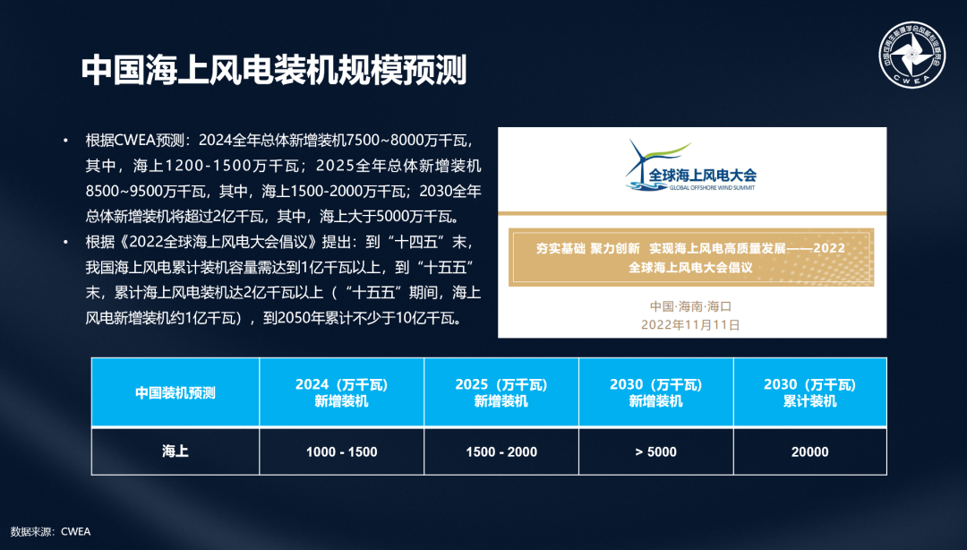 CWEA研究顯示,海上風(fēng)電規(guī)劃發(fā)展?jié)摿薮螅笆奈濉逼陂g,中國沿海地區(qū)海上風(fēng)電規(guī)劃容量約5500萬千瓦。預(yù)計2024全年總體新增裝機(jī)7500~8000萬千瓦,其中,海上1200-1500萬千瓦;2025全年總體新增裝機(jī)8500~9500萬千瓦,其中,海上1500-2000萬千瓦;2030全年總體新增裝機(jī)將超過2億千瓦,其中,海上大于5000萬千瓦。