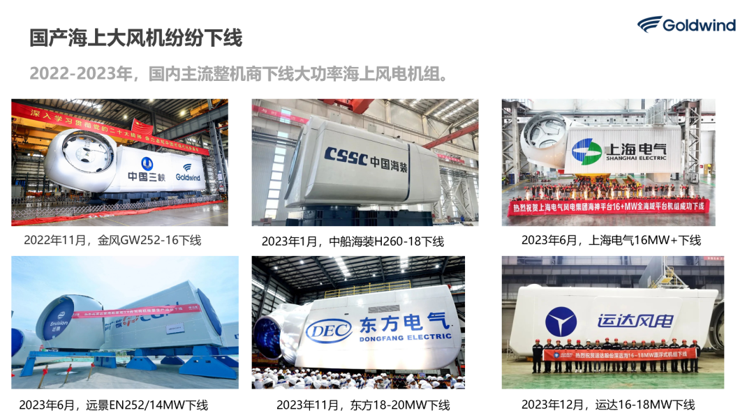 2021年海上風(fēng)電機(jī)組主流已經(jīng)在6MW到7MW水平,8MW到10MW機(jī)組已經(jīng)投入了試驗運(yùn)行。2022年海上風(fēng)電機(jī)組主流到了8MW左右,10MW到11MW機(jī)組已經(jīng)開始投入運(yùn)行了。2023年的12-13MW機(jī)組達(dá)到批量應(yīng)用, 2022年11月,金風(fēng)16MW機(jī)組下線了,到2023年6月在福建平潭吊裝完成,同時2023年中國海裝的18MW機(jī)組已經(jīng)下線,明陽的18MW機(jī)組也已經(jīng)下線,10月份明陽的22MW的機(jī)組,還有20MW的風(fēng)電機(jī)組都在持續(xù)下線。6月5日,由東方電氣自主研制的首臺18兆瓦半直驅(qū)大功率海上風(fēng)電機(jī)組,在廣東省汕頭市風(fēng)電臨海試驗基地成功完成吊裝,是當(dāng)前全球已安裝的最大功率等級海上風(fēng)電裝備,標(biāo)志著全球已安裝的海上風(fēng)電機(jī)組功率等級邁入新的里程碑。